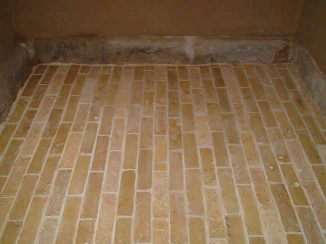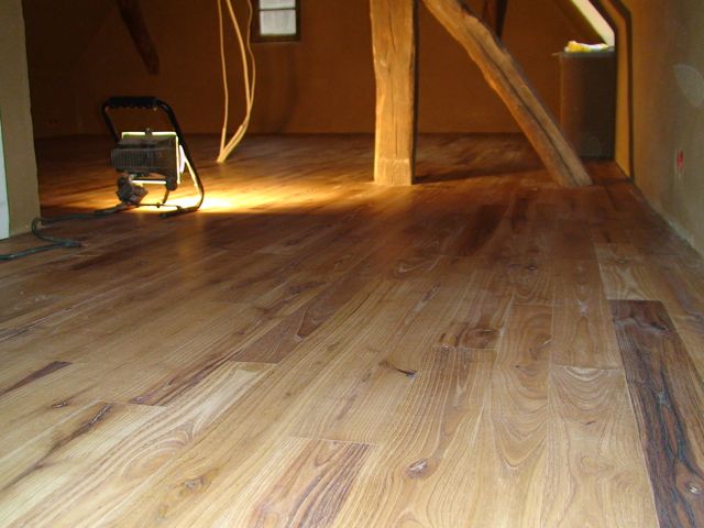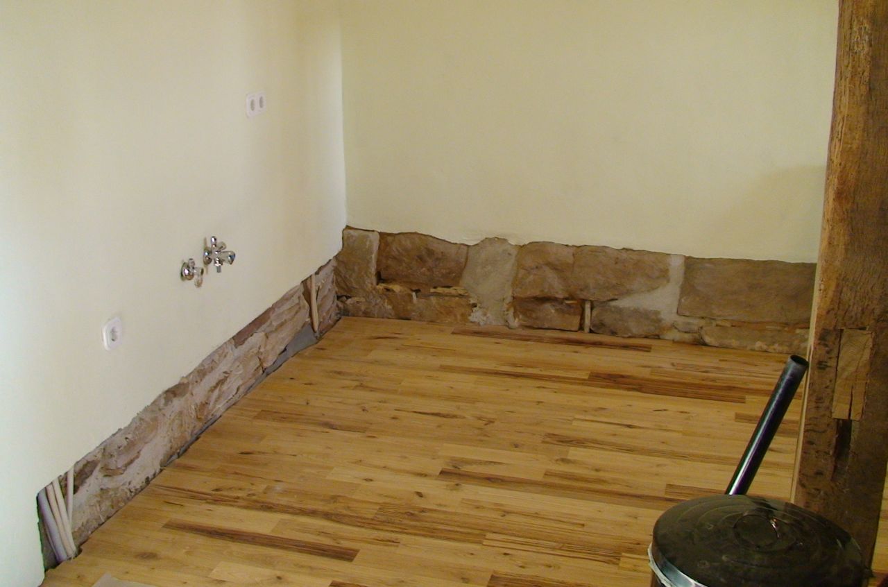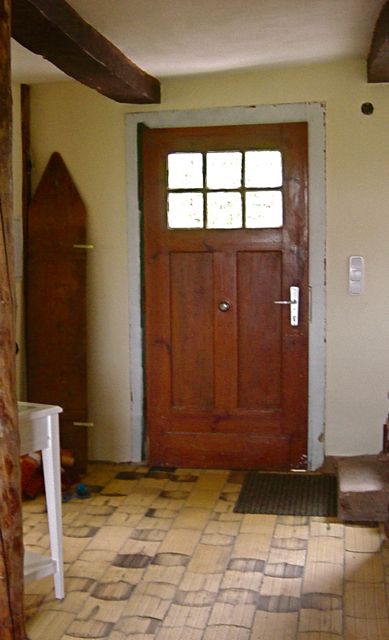 Schöne, passende und natürliche Fußböden zu finden, gehört zu den schwierigen Aufgaben beim Bauen. Hier sind einige Beispiele für interessante Lösungen. Das erste Bild zeigt alte, gelbe und unlasierte Mauerziegel, die halbiert und verlegt wurden. So entsteht keine Sperrschicht, wie bei Fliesen. Die Feuchte aus den Sandsteinen kann sich verteilen und es stockt nicht. Das selbe Prinzip wurde bei Bild 3 angewandt. Hier sehen Sie alte, gelbe und unlasierte Biber-schwänze. Die hier auf Bild 2 + 4 abgebildete Parkettdiele ist unbehandelte Kastanie Wildwuchs. Einen solchen Fußboden muß man schleifen, polieren und mit ökologischen Ölen behandeln.