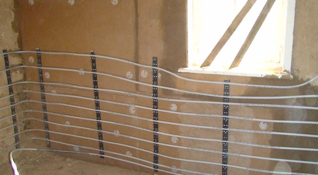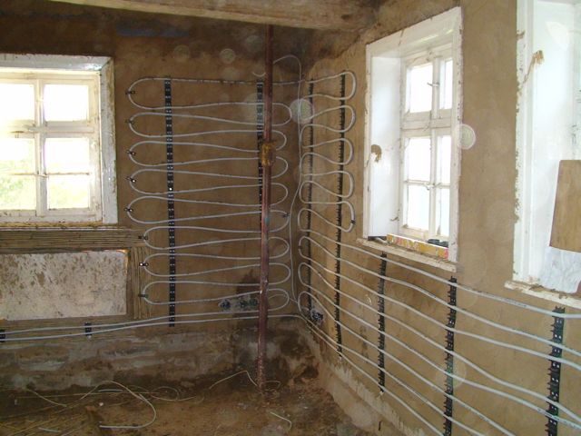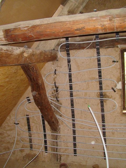 Die Wandheizung ist gerade im Fachwerkbau eine gute Lösung. Durch die oft verwendeten Dielen oder starken Parkette sind Fußbodenheizungen hier zu träge. Wandheizungen werden an das Heizsystem angeschlossen und funktionieren mit Wasser. Die Wärmeabgabe geschieht über Strahlungswärme. Die Heizschläuche werden einfach unter dem Lehmputz verlegt. Man muß sich nur bewußt sein, daß Anbringungen an der Wand nur nach vorherigem Test, bzw. Suchen der Heizschläuche, geschehen können. Die Wandheizung hat zu dem noch den Vorteil, daß die Wände durch das Aufheizen nicht feucht werden. Für das Raum- Wärmeempfinden eine tolle Sache.