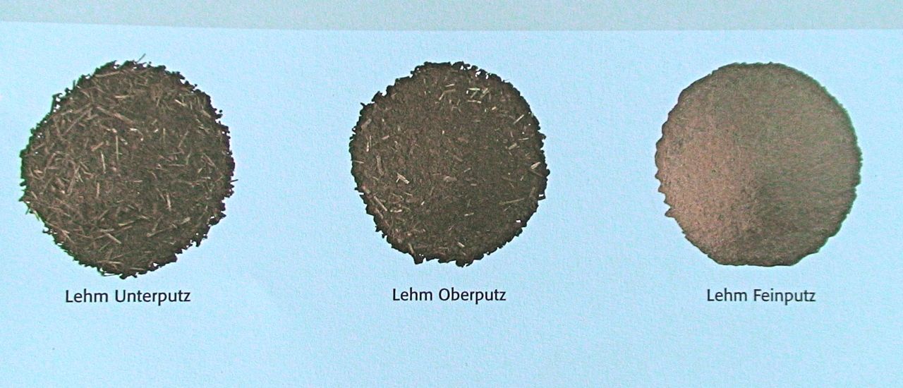 Lehmputze gibt es in verschiedenen Ausführungen. Wie unten zu sehen, gibt es den groberen Unterputz, den feineren Oberputz und verschiedene Fein- und Edelputze, die anstatt der Lehmfarbe als Finish eingesetzt werden können. Hierbei ist die Farbpalette durch die natürlich vorkommenden Lehm- und Beimischstoffe begrenzt. Putze haben jedoch den Vorteil, daß das natürliche Aussehen des Lehmes bestehen bleibt und zudem ein Arbeitsgang, das Anstreichen, gespart wird.
